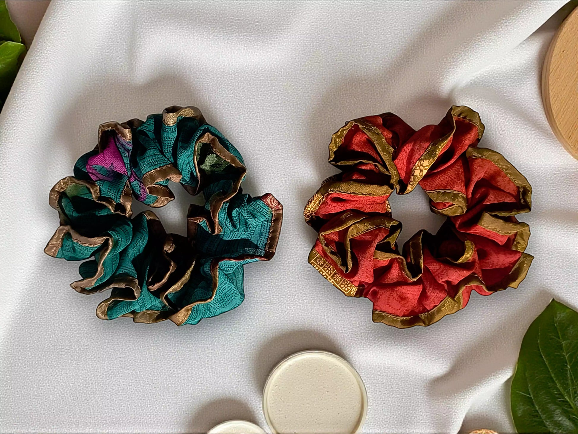 Our trimmed hair ties are a celebration of individuality and style. Each one is thoughtfully handcrafted, with recycled sari fabric and a contrasting trim. No two are exactly alike, making each piece a reflection of your own originality and flair.
